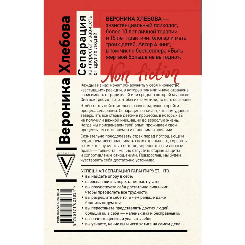 Сепарация: как перестать зависеть от других людей. Вероника Хлебова - экзистенциальный психолог, 10 лет личной терапии и 15 лет практики, блогер и мать троих детей. Автор 4 книг, в том числе бестселлера "Быть жертвой больше не выгодно". Каждый из нас может обнаружить у себя множество "застывших" реакций, в которых так или иначе отражена зависимость от родителей или среды, в которой мы росли. Они все требуют того, чтобы их заметили, то есть осознали. Чтобы стать действительно взрослым, нужно пройти процесс сепарации. Сепарация означает, что вам удалось завершить все старые детские процессы, в которых вы не получили важной инициации во взрослую жизнь. Когда мы присваиваем свой опыт, проживаем свои процессы, мы отделяемся и становимся зрелыми. Сознательно преодолевать страх перед поглощающим родителем, восстанавливать свою отдельность, горевать о том, что случилось в детстве, укреплять свои личные права - только так можно отпустить старые защиты и сопротивление отношениям. Повзрослев, мы будем чувствовать себя достаточно устойчиво. Прочитав книгу "Сепарация: как