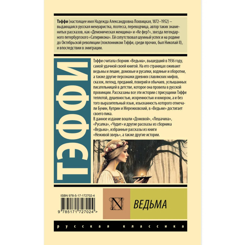 Тэффи считала сборник "Ведьма", вышедший в 1936 году, самой удачной своей книгой. На его страницах оживают ведьмы и лешие, домовые и русалки, водяные и оборотни, а также другие персонажи древних славянских мифов, сказок, легенд, преданий, поверий и обычаев, услышанных писательницей в детстве, которое она провела в русской провинции. Рассказаны все эти истории с присущими Тэффи теплотой, душевностью, искренностью и юмором, а и без того выразительный язык, изысканность которого отмечали Бунин, Куприн и Мережковский, в "Ведьме" достигает своего пика. В данное издание вошли "Домовой", "Лешачиха", "Русалка", "Чудит" и другие рассказы из сборника "Ведьма", избранные рассказы из книги "Неживой зверь", а также другие истории.