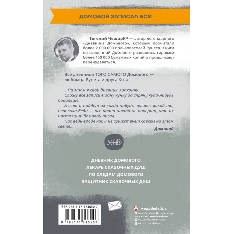 Все дневники ТОГО САМОГО Домового — любимца Рунета и друга Кота! Самая полная версия записок Домового и дневник Кота. Эти истории прочитали и продолжают читать миллионы! В книгу также вошли повести "Лекарь Сказочных Душ", "По следам Домового" и "Защитник Сказочных Душ". Домовой записал всё! Внутри — открытки Вячеслава Алатырского, художника, который нарисовал теплую вселенную Кота и Домового.