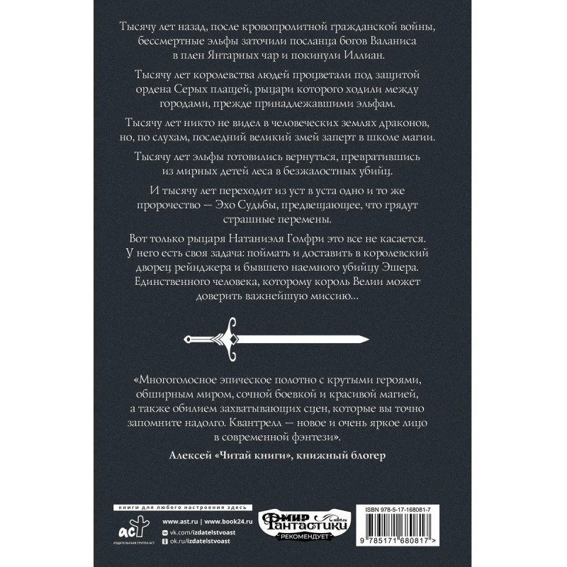 – Эпическое фэнтези от популярного английского автора. – Филип К. Квантрелл входит в десятку самых популярных авторов на Amazon. – Продуманный сюжет, динамичное повествование, кинематографичные экшен-сцены. – История с серой моралью о противостоянии людей, магов, злых эльфов и благородных драконов. – Придется по душе ценителям классического фэнтези и циклов «Ведьмак» Анджея Сапковского и «Властелин Колец» Джона Р. Р. Толкина.