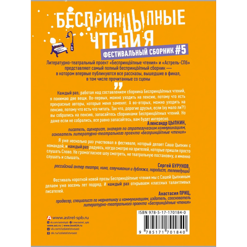 — Литературно-театральный проект «Беспринцыпные чтения» представляет самый полный и самый беспринцыпный сборник. — Впервые в истории проекта все вышедшие в финал рассказы публикуются на страницах книги. — Внутри вы найдете новые рассказы Александра Цыпкина, Александра Бессонова, Александра Маленкова, Соса Плиева и других авторов проекта. — Рассказы самых разных жанров — и комедия, и драма, и лирика, и мистика, и ужасы… — Лучшее, что можно найти в малой отечественной современной прозе — под одной обложкой.