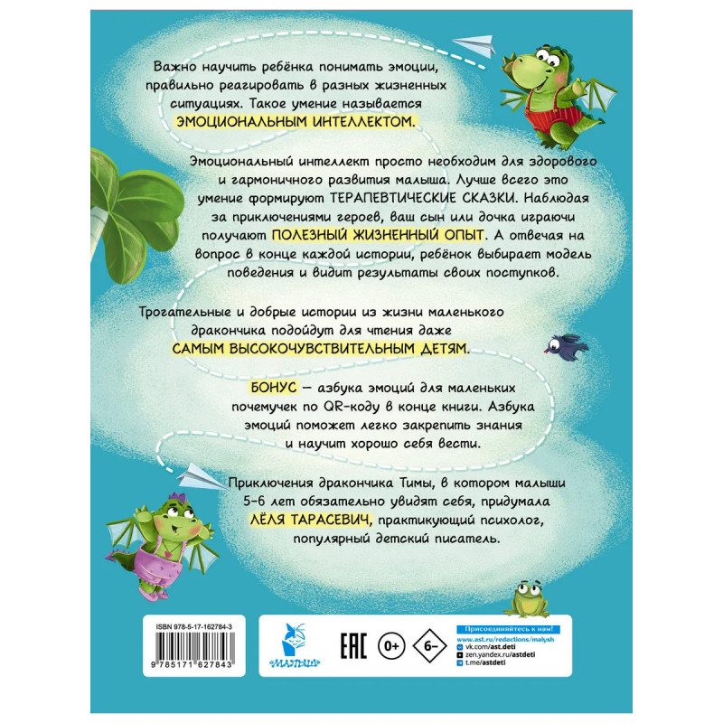 Все родители мечтают, чтобы малыш развивался гармонично, легко находил друзей и умел договориться с окружающими. Всё это достижимо, если с детства развивать эмоциональный интеллект. Эта книга станет для вас самым лучшим помощником. Терапевтические сказки Лёли Тарасевич, практикующего психолога и детского писателя покажут, какие бывают эмоции и как нужно поступать в разных жизненных ситуациях. Вместе с очаровательным дракошей Тимой ребята узнают, как справиться со злостью, чем полезна надежда, откуда берётся печаль и многое другое. Книгу можно читать неоднократно. Отвечая на вопросы в конце каждой главы, юные читатели создадут свои истории. Добрые и поучительные приключения дракоши подойдут для высокочувствительных детей. Они снизят тревожность и помогут лучше понимать себя и окружающих. Приятный бонус — азбука эмоций по QR-коду в конце книги, которая позволит закрепить полученные знания. Книга станет отличным подарком для маленьких почемучек.