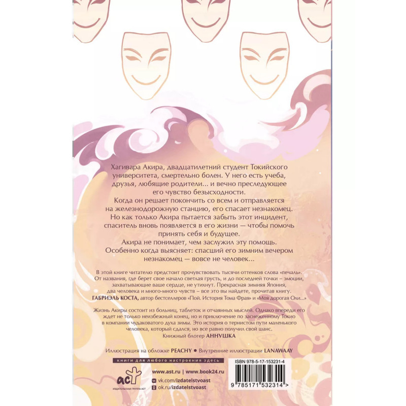 Смерть заберет с собой осень. - Теплая и печальная история о преодолении невзгод, силе духа и дружбе. - Самобытный, стильный азиатский сеттинг, который оценят поклонники романов "Благословение небожителей" Мосян Тунсю и "Рассеивая сумрак" Сэма Альфсена. - 9 место Wattpad в категории "Психология". - Книга дополнена иллюстрациями художников PEACHY и LANAWAAY. Знакомьтесь, это Хагивара Акира, и он умирает. У молодого студента Токийского университета смертельная болезнь, и он не знает, как провести последние месяцы своей жизни. Единственным выходом кажется идея свести счеты с ней раньше срока, но, когда он пытается это сделать, его спасает незнакомый человек. Как бы Акира ни пытался забыть эту историю, незнакомец появляется вновь, пытаясь примирить Хагивару с неизбежным будущем. В чем его цель и его загадка? Акира пытается ответить на эти вопросы, пока к нему на мягких лапах подкрадывается зима