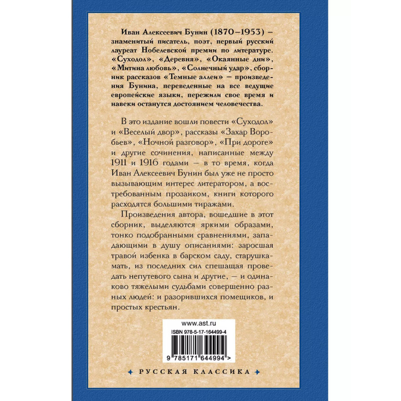 В это издание вошли повести "Суходол" и "Веселый двор", рассказы "Захар Воробьев", "Ночной разговор", "При дороге" и другие сочинения, написанные между 1911 и 1916 годами в то время, когда Иван Алексеевич Бунин был уже не просто вызывающим интерес литератором, а востребованным прозаиком, книги которого расходятся большими тиражами. Произведения автора, вошедшие в этот сборник, выделяются яркими образами, тонко подобранными сравнениями, западающими в душу описаниями: заросшая травой избенка в барском саду, старушка-мать, из последних сил спешащая проведать непутевого сына и другие, и одинаково тяжелыми судьбами совершенно разных людей: и разорившихся помещиков, и простых крестьян.