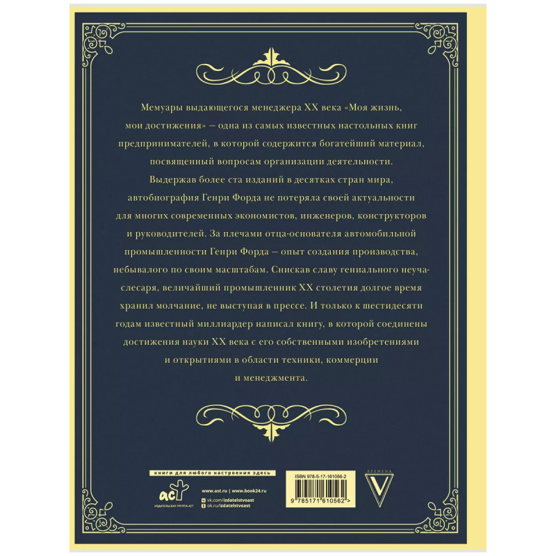 Моя жизнь. Мои достижения. Подарочное издание. Мемуары выдающегося менеджера XX века "Моя жизнь" - одна из самых известных настольных книг предпринимателей, в которой содержится богатейший материал, посвященный вопросам организации деятельности. Выдержав более ста изданий в десятках стран мира, автобиография Генри Форда не потеряла своей актуальности для многих современных экономистов, инженеров, конструкторов и руководителей. За плечами отца-основателя автомобильной промышленности Генри Форда - опыт создания производства, небывалого по своим масштабам и организации. Снискав славу гениального неуча-слесаря, величайший промышленник XX столетия долгое время хранил молчание, не выступая в прессе. И только к шестидесяти годам известный миллиардер написал книгу, в которой соединены достижения науки двадцатого века с его собственными изобретениями и достижениями в области техники, коммерции и менеджмента.