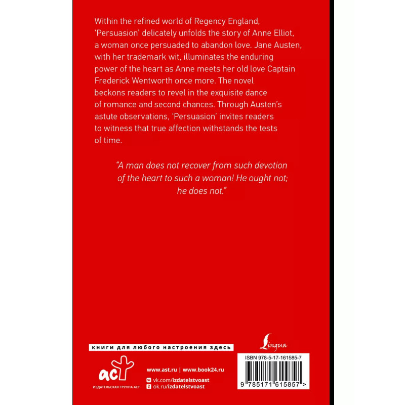 КНИГА НА АНГЛИЙСКОМ ЯЗЫКЕ Предпочитаете учиться у носителей? Тогда у кого же, как не у Джейн Остен? Persuasion" или "Доводы рассудка" - это последний роман Остен, писательницы, с чьим именем неразрывно связана английская литература. Он рассказывает о судьбе Энн Элиотт, девушки, которая отказалась от помолвки, уступив доводам "мудрых" людей. Через несколько лет она вновь сталкивается с со своим прежним женихом. Прекрасный шанс для неё; но теплится ли ещё любовь в его сердце? Это самый зрелый роман Джейн Остен, достаточно небольшой, чтобы без труда прочесть его. Текст приведен без адаптации и сокращений. Наслаждайтесь изысканной иронией Джейн Остен в оригинале!
