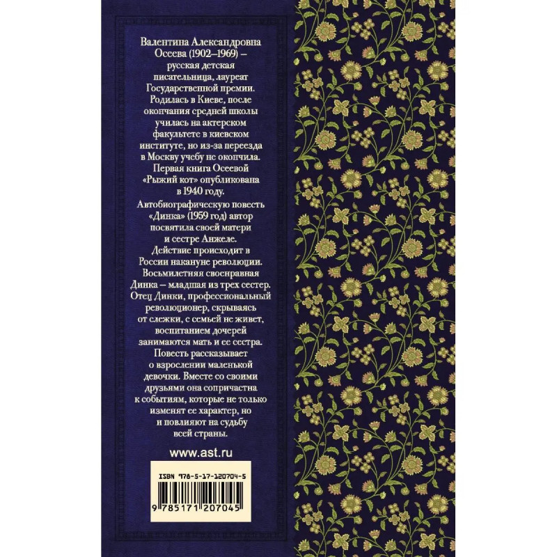 Валентина Александровна Осеева (1921969) русская детская писательница, лауреат Государственной премии. Родилась в Киеве, после окончания средней школы училась на актерском факультете в киевском институте, но из-за переезда в Москву учебу не окончила. Первая книга Осеевой "Рыжий кот" опубликована в 194 г. Автобиографическую повесть "Динка" (1959 г.) автор посвятила своей матери и сестре Анжеле. Действие повести происходит в России накануне революции. Восьмилетняя своенравная Динка младшая из трех сестер. Отец Динки, профессиональный революционер, скрываясь от слежки, с семьей не живет, воспитанием дочерей занимаются мать и ее сестра. Повесть рассказывает о взрослении маленькой девочки. Вместе со своими друзьями она сопричастна событиям, которые не только изменят ее характер, но и повлияют на судьбу всей страны.