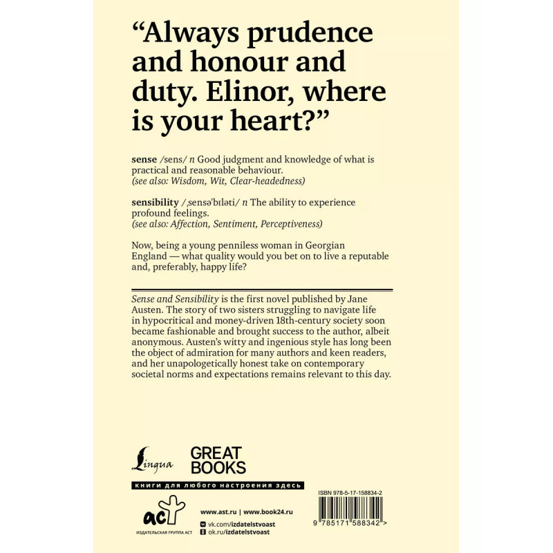Sense and Sensibility. Разум - мыслительная способность, позволяющая логически осмыслять действительность. Чувство - способность воспринимать внешние воздействия; также "эмоция" или "переживание". Итак, представьте, что вы молодая девушка в Англии XVIII века, не замужем и без гроша в кармане - какое из этих качеств вы выберете, чтобы сохранить достоинство и прожить счастливую жизнь? "Разум и чувство" - роман Джейн Остен о двух сестрах-бесприданницах, которые пытаются обрести счастье в лицемерном аристократическом обществе эпохи Регентства. Остроумный и афористичный слог Остен, лишенный чрезмерной сентиментальности и витиеватости, завоевал сердца читателей по всему миру, а ее беспристрастный взгляд на существующие социальные порядки и роли по сей день не теряет остроты. Насладитесь романом Джейн Остен на языке оригинала без сокращений и адаптации.