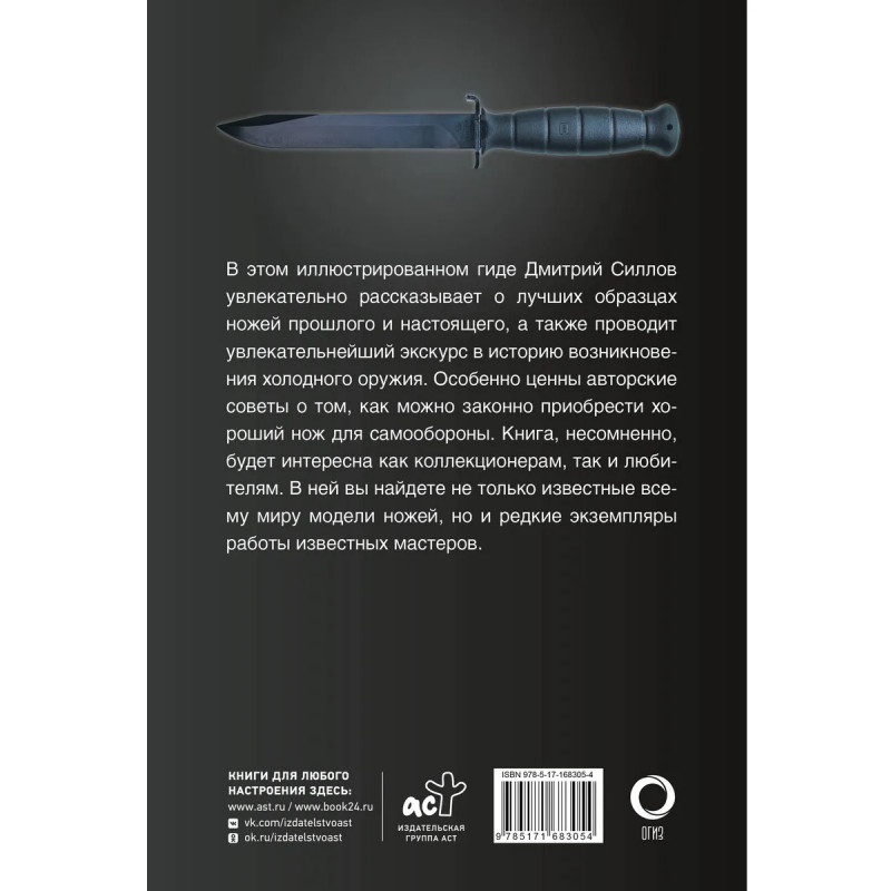 Дмитрий Олегович Силлов современный российский писатель, инструктор по бодибилдингу и рукопашному бою, автор многих произведений о самообороне, боевых и охотничьих ножах. Поклонники боевой фантастики, несомненно, знают его как автора более двадцати романов в сериях "Сталкер", "Кремль 2222", "Роза миров" и других. В этом иллюстрированном гиде Дмитрий Силлов увлекательно рассказывает о лучших образцах ножей прошлого и настоящего, а также проводит увлекательнейший экскурс в историю возникновения холодного оружия. Особенно ценны авторские советы о том, как можно законно приобрести хороший нож для самообороны. Книга, несомненно, будет интересна как коллекционерам, так и любителям. В ней вы найдете не только известные всему миру модели ножей, но и редкие экземпляры работы известных мастеров. ДМИТРИЙ ОЛЕГОВИЧ СИЛЛОВ современный российский писатель, инструктор по рукопашному бою и бодибилдингу, автор многих произведений о самообороне, боевых и охотничьих ножах, а также более сорока романов, написанных в жанре бое