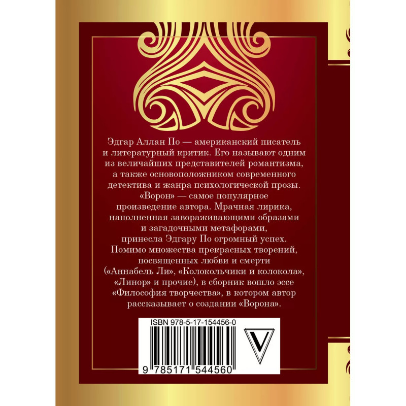 Ворон. Эдгар Аллан По - американский писатель и литературный критик. Его называют одним из величайших представителей романтизма, а также основоположником современного детектива и жанра психологической прозы. "Ворон" - самое популярное произведение автора. Мрачная лирика, наполненная завораживающими образами и загадочными метафорами, принесла Эдгару По огромный успех. Помимо множества прекрасных творений, посвященных любви и смерти ("Аннабель Ли", "Колокольчики и колокола", "Линор" и прочих), в сборник вошло эссе "Философия творчества", в котором автор рассказывает о создании "Ворона".
