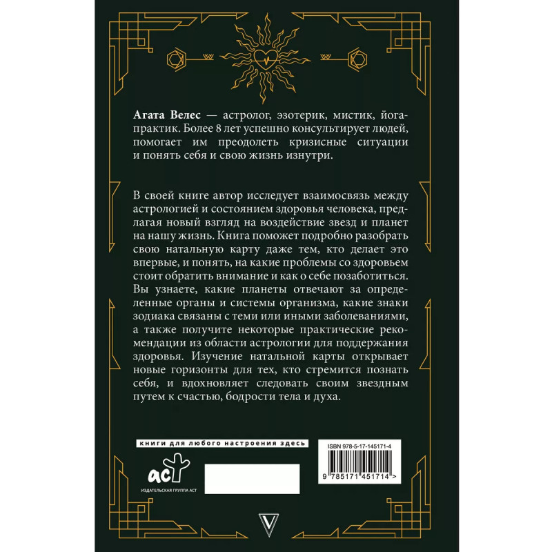 В своей книге автор исследует взаимосвязь между астрологией и состоянием здоровья человека, предлагая новый взгляд на воздействие звезд и планет на нашу жизнь. Книга поможет подробно разобрать свою натальную карту даже тем, кто делает это впервые, и понять, на какие проблемы со здоровьем стоит обратить внимание и как как о себе позаботиться. Вы узнаете, какие планеты отвечают за определенные органы и системы организма, какие знаки зодиака связаны с теми или иными заболеваниями, а также получите некоторые практические рекомендации из области астрологии для поддержания здоровья. Изучение натальной карты открывает новые горизонты для тех, кто стремится к гармонии тела и духа, и вдохновляет следовать своим звездным путем к счастью, бодрости тела и духа.