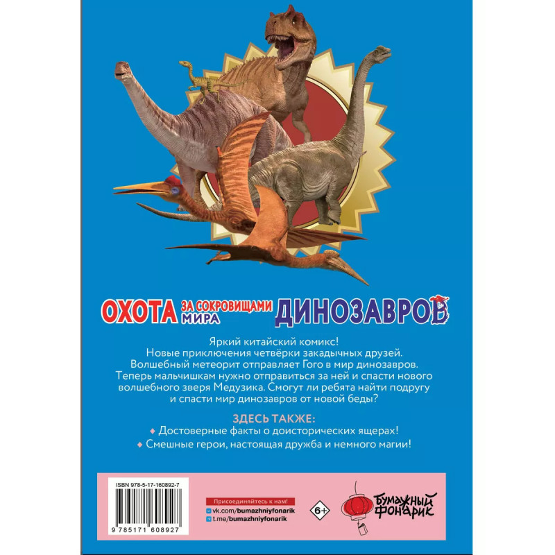 Охота за сокровищами мира динозавров. Том 2: Волшебный метеорит. "Охота за сокровищами мира динозавров" - это популярный китайский комикс о динозаврах для юных читателей. Встречайте команду охотников за сокровищами - Мика, Кики, Гого и Юэбаня! Случайно взявшись за волшебный метеорит, Гого перенеслась в эпоху динозавров. Мальчики отправились вслед за ней, но оказалось, что мир динозавров снова нуждается в помощи. Огромный заурофаганакс пожирает всё вокруг без разбора. Он проглотил метеорит, а теперь под угрозой оказались и новые друзья ребят - волшебный зверь Медузик, его семья, а также их приятели динозавры. Как же Мик, Кики, Гого и Юэбань справятся с новой бедой? Эта книга - смесь приключенческой истории и реальных фактов о динозаврах, благодаря которым дети смогут легко узнать об эпохе, когда на Земле царствовали доисторические ящеры. Для среднего школьного возраста.