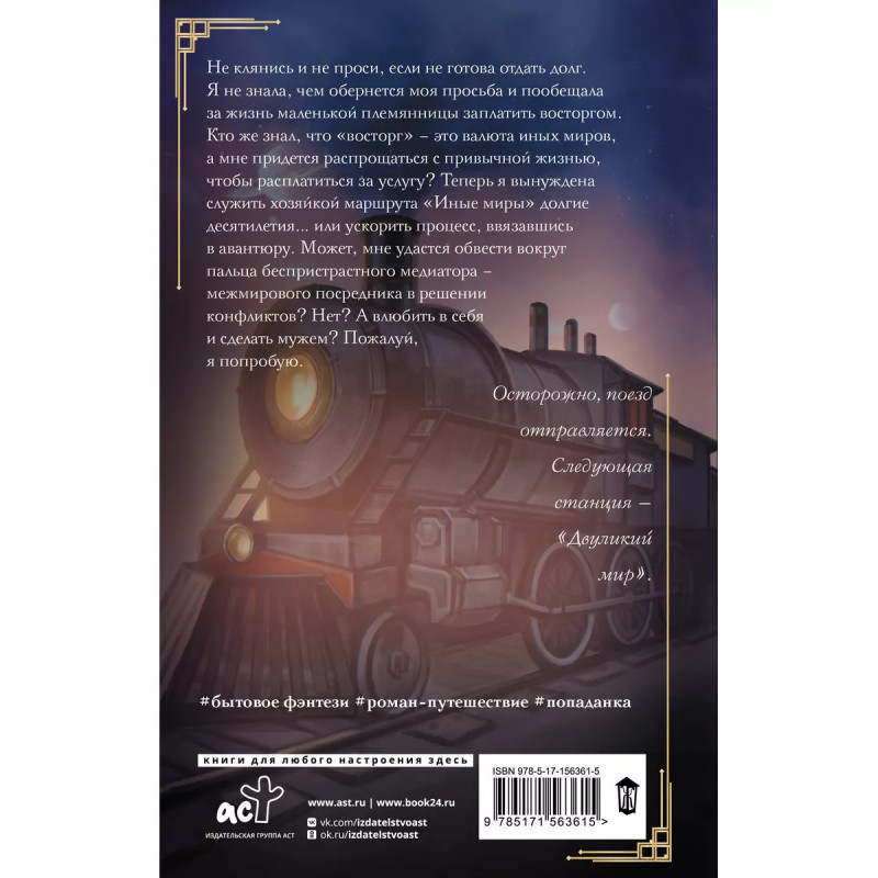 Хозяйка маршрута "Иные миры". Не клянись и не проси, если не готова отдать долг. Я не знала, чем обернется моя просьба и пообещала за жизнь маленькой племянницы заплатить восторгом. Кто же знал, что "восторг" - это валюта иных миров, а мне придется распрощаться с привычной жизнью, чтобы расплатиться за услугу? Теперь я вынуждена служить хозяйкой маршрута "Иные миры" долгие десятилетия или ускорить процесс, ввязавшись в авантюру. Может, мне удастся обвести вокруг пальца беспристрастного медиатора - межмирового посредника в решении конфликтов? Нет? А влюбить в себя и сделать мужем? Пожалуй, я попробую.