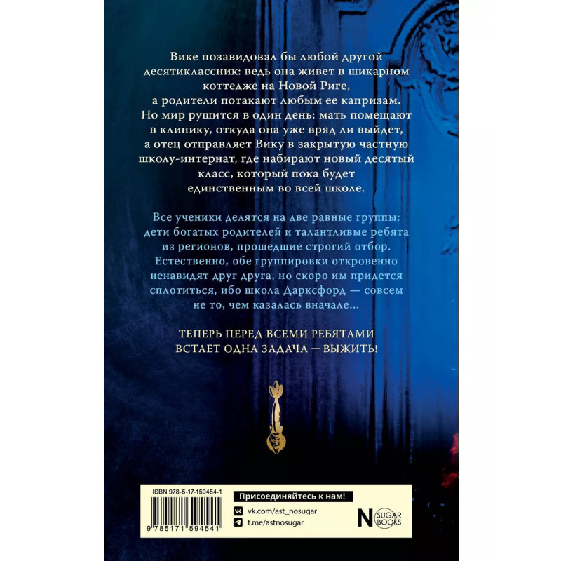 Дарксфорд. Вике позавидовал бы любой другой десятиклассник: ведь она живет в шикарном коттедже на Новой Риге, а родители потакают любым ее капризам. Но мир рушится в один день: мать помещают в клинику, откуда она уже вряд ли выйдет, а отец отправляет Вику в закрытую частную школу-интернат, где набирают новый десятый класс, который пока будет единственным во всей школе. Все ученики делятся на две равные группы: дети богатых родителей и талантливые ребята из регионов, прошедшие строгий отбор. Естественно, обе группировки откровенно ненавидят друг друга, но скоро им придется сплотиться, ибо школа Дарксфорд - совсем не то, чем казалась в начале Теперь перед всеми ребятами встает одна задача: выжить!