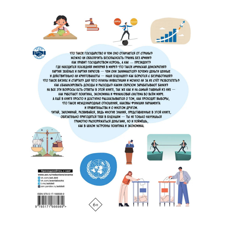 Дорогие родители! Наверняка вы хотите, чтобы ваш ребёнок рос всесторонне развитым и образованным, уверенно ориентировался в таком огромном и разнообразном мире, политическое и экономическое устройство которого неотъемлемая часть самого существования человеческой цивилизации. Порой постигнуть многие вопросы политики и экономики, финансовые процессы нелегко даже взрослому, здесь же мы простым и понятным языком познакомим маленьких читателей со сложными вещами, о которых они постоянно задают вопросы. Рассматриваемые темы на первый взгляд могут показаться скучными, но здесь они раскрываются увлекательно и очень доступно для детей. Путешествуя по страницам книги, они познакомятся с ключевыми понятиями государственного устройства, научатся понимать разницу между различными политическими системами, изучат основные правила государственного управления. Это поможет им построить собственное представление о том, как действует мир политики и как они сами могут влиять на него.