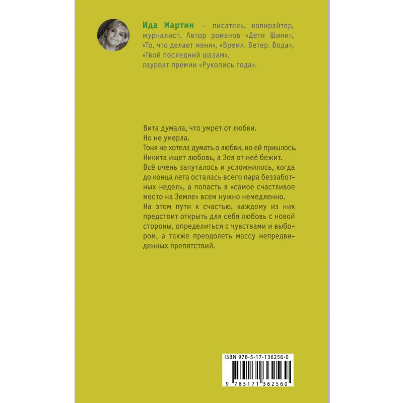 Вита думала, что умрет от любви. Но не умерла. Тоня не хотела думать о любви, но ей пришлось. Никита ищет любовь, а Зоя от неё бежит. Всё очень запуталось и усложнилось, когда до конца лета осталась всего пара беззаботных недель, а попасть в "самое счастливое место на Земле" всем нужно немедленно. На этом пути к счастью, каждому из них предстоит открыть для себя любовь с новой стороны, определиться с чувствами и выбором, а также преодолеть массу непредвиденных препятствий.