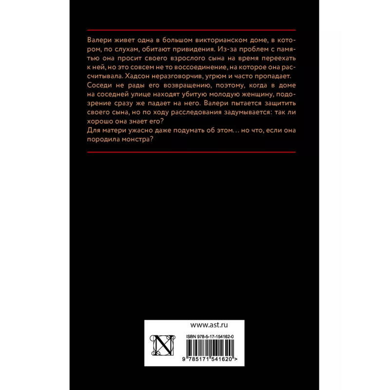Ни слова маме. Валери живет одна в большом викторианском доме, в котором, по слухам, обитают привидения. Из-за проблем с памятью она просит своего взрослого сына на время переехать к ней, но это совсем не то воссоединение, на которое она рассчитывала. Хадсон неразговорчив, угрюм и часто пропадает. Соседи не рады его возвращению, поэтому, когда в доме на соседней улице находят убитую молодую женщину, подозрение сразу же падает на него. Валери пытается защитить своего сына, но по ходу расследования задумывается: так ли хорошо она знает его? Для матери ужасно даже подумать об этом... но что, если она породила монстра?