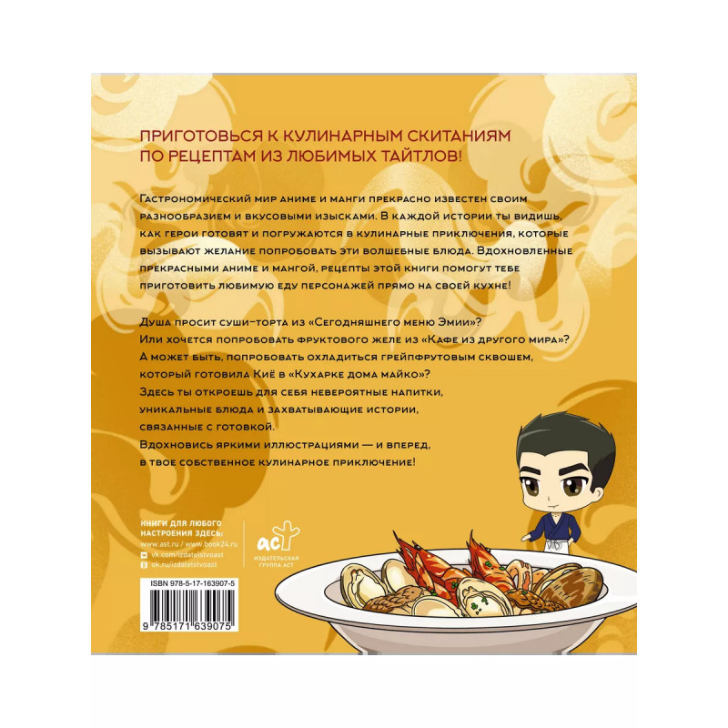 Приготовься к кулинарным скитаниям по рецептам из любимых тайтлов! Гастрономический мир аниме и манги прекрасно известен своим разнообразием и вкусовыми изысками. В каждой истории ты видишь, как герои готовят и погружаются в кулинарные приключения, которые заставляют захотеть попробовать эти волшебные блюда. Вдохновленные прекрасными аниме и мангой, рецепты этой книги помогут тебе приготовить любимую еду персонажей прямо на своей кухне! Душа просит суши-торта из Сегодняшнего меню Эмии? Или хочется попробовать фруктового желе из Кафе из другого мира? А может быть, попробовать охладиться грейпфрутовым сквошем, который готовила Киё в Кухарке дома майко? Здесь ты откроешь для себя невероятные напитки, уникальные блюда и захватывающие истории, связанные с готовкой. Вдохновись яркими иллюстрациями и вперед, в твое собственное кулинарное приключение!
