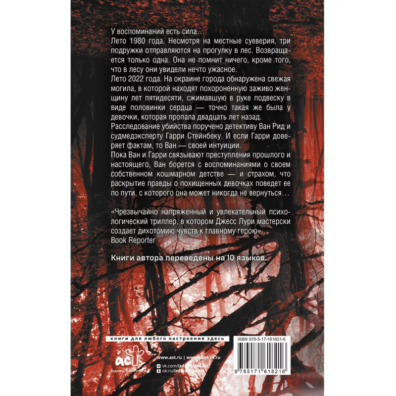 Похищенные. У воспоминаний есть сила Лето 1980 года. Несмотря на местные суеверия, три подружки отправляются на прогулку в лес. Возвращается только одна. Она не помнит ничего, кроме того, что в лесу они увидели нечто ужасное. Лето 2022 года. На окраине города обнаружена свежая могила, в которой находят похороненную заживо женщину лет пятидесяти, сжимавшую в руке подвеску в виде половинки сердца - точно такая же была у девочки, которая пропала двадцать лет назад. Расследование убийства поручено детективу Ван Рид и судмедэксперту Гарри Стейнбеку. И если Гарри доверяет фактам, то Ван - своей интуиции. Пока Ван и Гарри связывают преступления прошлого и настоящего, Ван борется с воспоминаниями о своем собственном кошмарном детстве - и страхом, что раскрытие правды о похищенных девочках поведет ее по пути, с которого она может никогда не вернуться