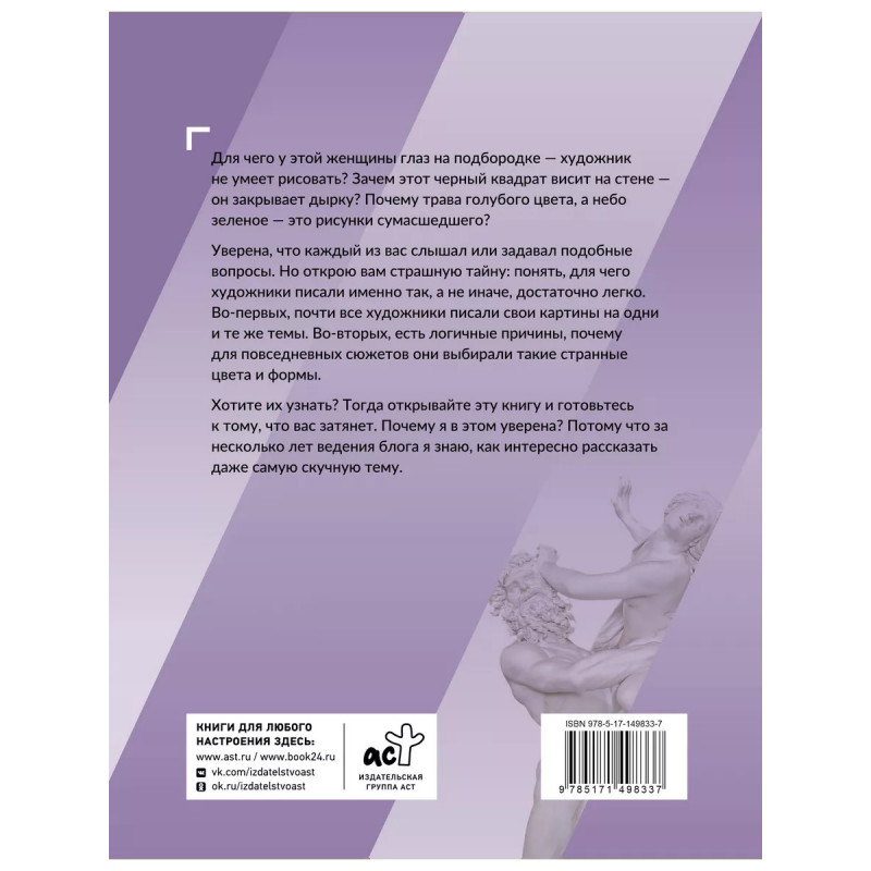Для чего у этой женщины глаз на подбородке - художник не умеет рисовать? Зачем этот черный квадрат висит на стене - он закрывает дырку на стене? Почему трава голубого цвета, а небо зеленое - это рисунки сумасшедшего? Уверена, что каждый из вас слышал или задавал подобные вопросы. Но открою вам страшную тайну: понять, для чего художники писали именно так, а не иначе, достаточно легко. Во-первых, почти все художники писали свои картины на одни и те же темы. Во-вторых, есть логичные причины, почему для повседневных сюжетов они выбирали такие странные цвета и формы. Хотите их узнать? Тогда открывайте эту книгу, и готовьтесь к тому, что вас затянет. Почему я в этом уверена? Потому что за несколько лет ведения блога, я знаю, как интересно рассказать даже самую скучную тему.