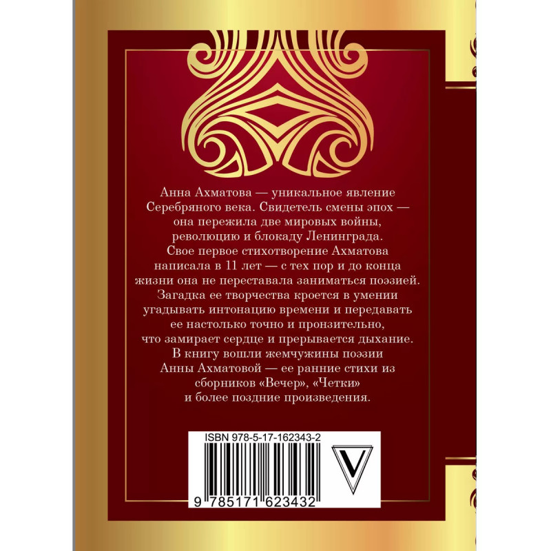 Анна Ахматова уникальное явление Серебряного века. Свидетель смены эпох она пережила две мировые войны, революцию и блокаду Ленинграда. Свое первое стихотворение Ахматова написала в 11 лет с тех пор и до конца жизни она не переставала заниматься поэзией. Загадка ее творчества кроется в умении угадывать интонацию времени и передавать ее настолько точно и пронзительно, что замирает сердце и прерывается дыхание. В книгу вошли жемчужины поэзии Анны Ахматовой ее ранние стихи из сборников "Вечер", "Четки" и более поздние зрелые произведения.