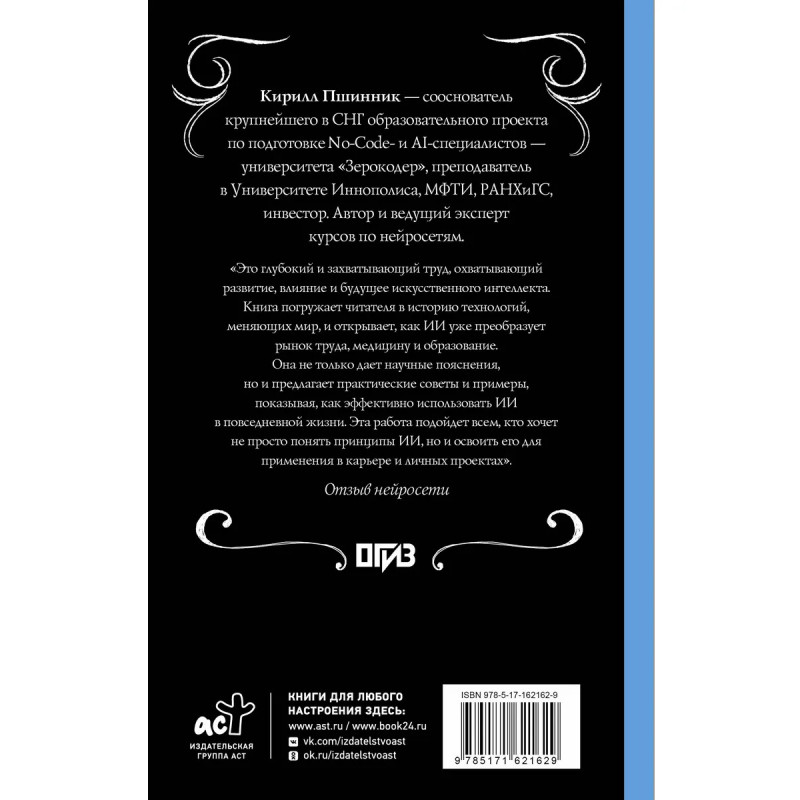 В этой книге автор делится личной историей знакомства с искусственным интеллектом и тем, как он изменил авторский взгляд на будущее. Глобальное исследование, проходящее через различные этапы развития технологий, от первых экспериментальных систем до современных нейросетей, таких как ChatGPT, показывает, как ИИ трансформирует нашу повседневную жизнь, бизнес и рынок труда. Эта книга не просто о технологиях, но о том, как они влияют на нас, заставляя адаптироваться, менять подход к обучению и работе. Искусственный интеллект — это новый инструмент, который может стать "великим уравнителем", дающим каждому возможность развивать свои сильные стороны и добиваться больших результатов. В книге вы найдете множество примеров, кейсов, а также полезные советы для тех, кто хочет понять, как работать с ИИ и как стать частью этого глобального процесса трансформации.
