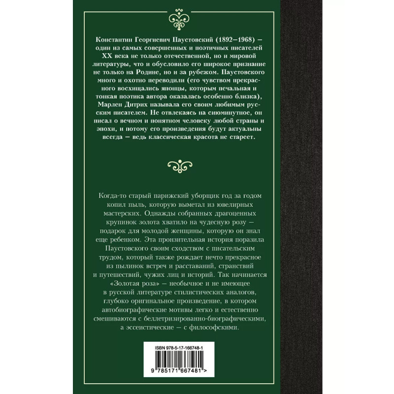 От автора книг Кара-Бугаз, Теплый хлеб и Повесть о жизни. Личный взгляд автора на писательское мастерство и психологию творчества. Золотая роза необычное и не имеющее стилистических аналогов в русской литературе произведение, посвященное литературному мастерству и психологии творчества. В самом начале Паустовский сравнивает писательский труд с Золотой розой из истории о парижском уборщике, который годами копил золотую пыль, выметаемую им из ювелирных мастерских, чтобы слепить подарок для девушки, которую он знал еще совсем ребенком. По мнению Паустовского, написанная книга это та же золотая роза, родившаяся из пылинок встреч и расставаний, странствий и путешествий, чужих лиц и историй, услышанных и увиденных автором за долгие годы. В Золотой розе автобиографические мотивы легко и естественно смешиваются с беллетризированно-биографическими, а эссеистические с философскими.