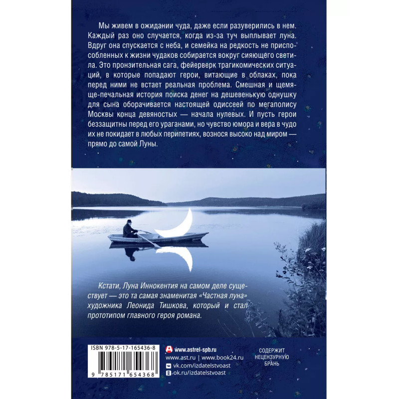 Самая веселая книга Марины Москвиной. Яркий, добрый, светлый и очень увлекательный роман о девяностых. Мы живем в ожидании чуда, даже если разуверились в нем! Каждый раз оно случается, когда из-за туч выплывает луна. Вдруг она спускается с неба, и семейка на редкость не приспособленных к жизни чудаков собирается вокруг сияющего светила. Это пронзительная сага, фейерверк трагикомических ситуаций, в которые попадают герои, витающие в облаках, пока перед ними не встает реальная проблема. Смешная и щемяще-печальная история поиска денег на дешевенькую однушку для сына оборачивается настоящей одиссеей по миру Москвы конца девяностых начала нулевых. И пусть герои беззащитны перед его ураганами, но чувство юмора и вера в чудо их не покидает в любых перипетиях, вознеся высоко над миром прямо до самой луны.