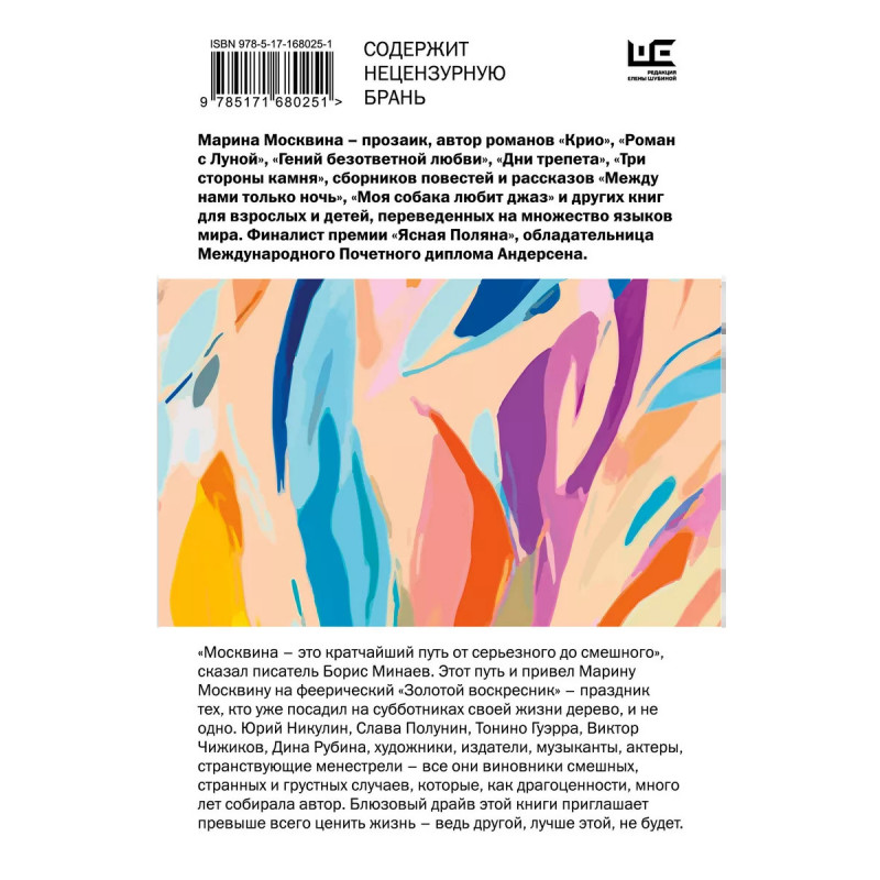 В Редакции Елены Шубиной выходит переиздание сборника прозы Золотой воскресник Марины Москвиной одного из самых светлых современных писателей, финалиста премии Ясная Поляна, лауреата Международного почетного диплома Андерсена, автора книг Роман с Луной, Крио, Три стороны камня, Моя собака любит джаз и многих других. Золотой воскресник - это собрание голосов известных и неизвестных, но очень необычных людей: слова художников, шутки поэтов, байки музыкантов, которые так и хочется разобрать на цитаты. Люди-легенды Юрий Никулин, Рина Зеленая, Георгий Бурков, Тонино Гуэрра, Виктор Чижиков, Слава Полунин, Юрий Коваль, Асар Эппель, Андрей Битов, Резо Габриадзе, Даур Зантария о каждом у Москвиной ворох историй. Читаешь Золотой воскресник и представляешь себе его героев живыми, настоящими, а не в бронзе и броне. За каждой репликой судьба. Книга идеальна для того, чтобы обратиться к ней, когда руки опускаются и будущее кажется беспросветным, а жизнь однообразной.