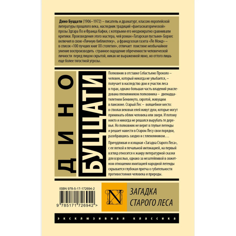 — Классика итальянской литературы XX века. — Для всех любителей мифов и притч. — На страницах «Загадки Старого Леса» переплетаются литературная сказка, магический реализм и глубокая философская притча — За незатейливой в сюжетном отношении имитацией народной легенды скрывается глубокая притча о губительности противостояния человека и природы. — Издание в серии «Эксклюзивная классика (Лучшее)» — в узнаваемом оформлении и твердой обложке.