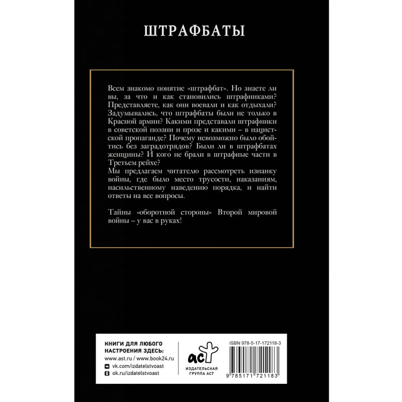 Всем знакомо понятие "штрафбат". Но знаете ли вы, за что и как становились штрафниками? Представляете, как они воевали и как отдыхали? Задумывались, что штрафбаты были не только в Красной армии? Какими представали штрафники в советской поэзии и прозе и какими – в нацистской пропаганде? Почему невозможно было обойтись без заградотрядов? Были ли в штрафбатах женщины? И кого не брали в штрафные части в Третьем рейхе? Мы предлагаем читателю рассмотреть изнанку войны, где было место трусости, наказаниям, насильственному наведению порядка, и найти ответы на все вопросы. Тайны "оборотной стороны" Второй мировой войны – у вас в руках!