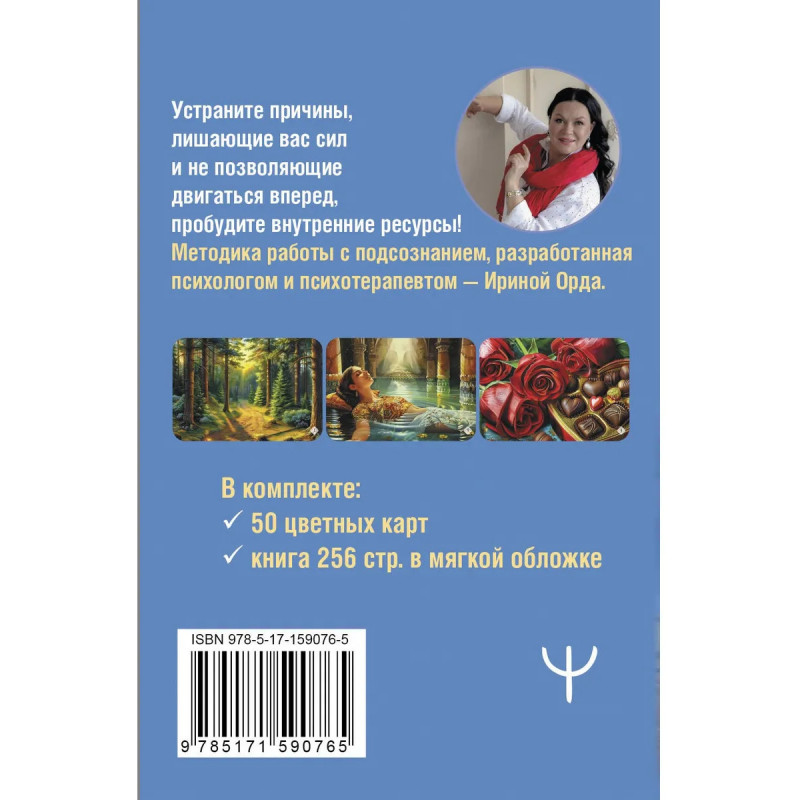 Основная причина того, что взрослые, образованные, компетентные люди всю жизнь "прозябают" на нелюбимой работе, не реализуют свои мечты, а их творческие способности так и остаются нераскрытыми — нехватка ресурсов. Как получить доступ к источнику жизненных сил? Как научиться использовать свой потенциал по максимуму и добиваться всех поставленных целей? Ответ помогут найти специальные техники работы с авторской колодой метафорических ассоциативных карт Ирины Орда. Метафорические ассоциативные карты с изображением различных жизненных ситуаций откроют вам доступ к подсознанию, помогут разобраться в своих проблемах, найти ответы на важные вопросы и обрести неиссякаемые источники ресурсов для счастливых перемен в жизни. При помощи подробного руководства вы освоите работу с МАК и сможете использовать психологические приемы и практики и для работы с любыми другими колодами. Авторская колода и книга Ирины Орда помогут найти ответы на эти вопросы и устранить причины, лишающие вас сил.