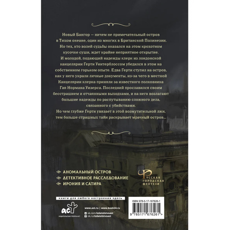 • Второй том нуарного мистического детектива в околовикторианском сеттинге. • Стимпанк в удаленном городе-острове, откуда нельзя выбраться. По улицам ходят механические автоматоны и путешественники во времени, а судьбы людей вершат чокнутый компьютер и кровожадный серийный убийца. • Захватывающий многогранный роман одновременно смешной, с иронией в духе Терри Пратчетта, и до дрожи ужасающий. • Понравится любителям детективов в викторианском сеттинге, жутких произведений Говарда Лавкрафта и легендарной серии ужасов Рика Янси «Монстролог».