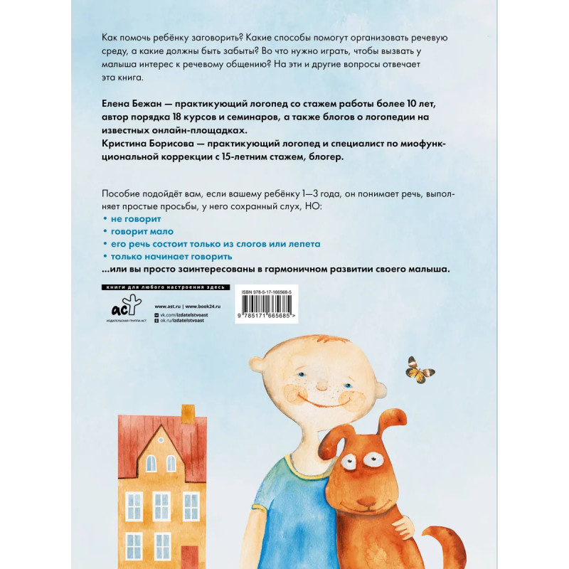 Ищете инструкцию, как помочь ребёнку заговорить? Это издание для вас! Практикующие логопеды с многолетним опытом, блогеры Елена Бежан и Кристина Борисова создали пособие, которое станет практическим руководством по созданию речевой среды. Эта книга подойдёт вам, если вашему ребёнку 1-3 года, но он не говорит или говорит мало, его речь состоит только из слогов или лепета, а также если вы просто заинтересованы во всестороннем развитии малыша. На страницах пособия теоретический материал для родителей чередуется с заданиями для детей, которые можно выполнять прямо в книге. Материал расположен от простого к сложному. В конце находится приложение, которое можно вырезать и играть в развивающие игры так, как вам захочется.