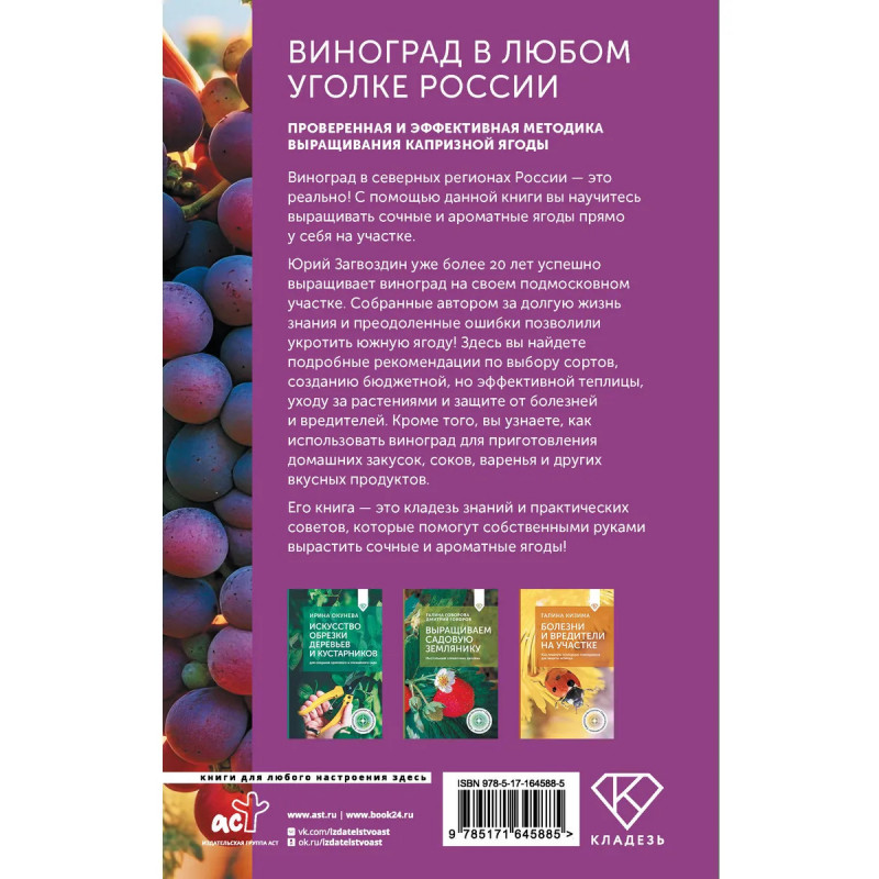 Виноград в северных регионах России — это реально! С помощью данной книги вы научитесь выращивать сочные и ароматные ягоды прямо у себя на участке. Юрий Загвоздин уже более 20 лет успешно выращивает виноград на своем Подмосковном участке, который не слишком пригоден для этой культуры. Собранные автором за долгую жизнь знания и преодоленные ошибки позволили укротить южную ягоду! Здесь вы найдете подробные рекомендации по выбору сортов, созданию бюджетной, но эффективной теплицы, уходу за растениями и защите от болезней и вредителей. Кроме того, вы узнаете, как использовать виноград для приготовления домашних закусок, соков, варенья и других вкусных продуктов. С пошаговыми инструкциями и множеством советов по каждому вопросу повторить результат сможет каждый. Его книга — это кладезь знаний и практических советов, которые помогут собственными руками вырастить сочные и ароматные ягоды.