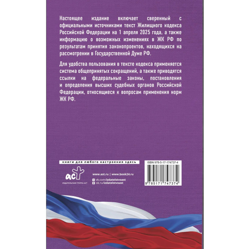 Данное издание Жилищного кодекса РФ сверено с официальным источником и приводится по состоянию на 1 апреля 2025 года. Кодекс учитывает все изменения, опубликованные в официальных источниках на момент подписания издания в печать. В издании представлена информация о возможных изменениях в ЖК РФ по результатам принятия законопроектов, находящихся на рассмотрении в Государственной Думе РФ. Для удобства пользования в тексте кодекса применяется система общепринятых сокращений, а также приводятся ссылки на федеральные законы, постановления Правительства Российской Федерации, постановления и определения высших судебных органов Российской Федерации, относящиеся к вопросам применения норм ЖК РФ.
