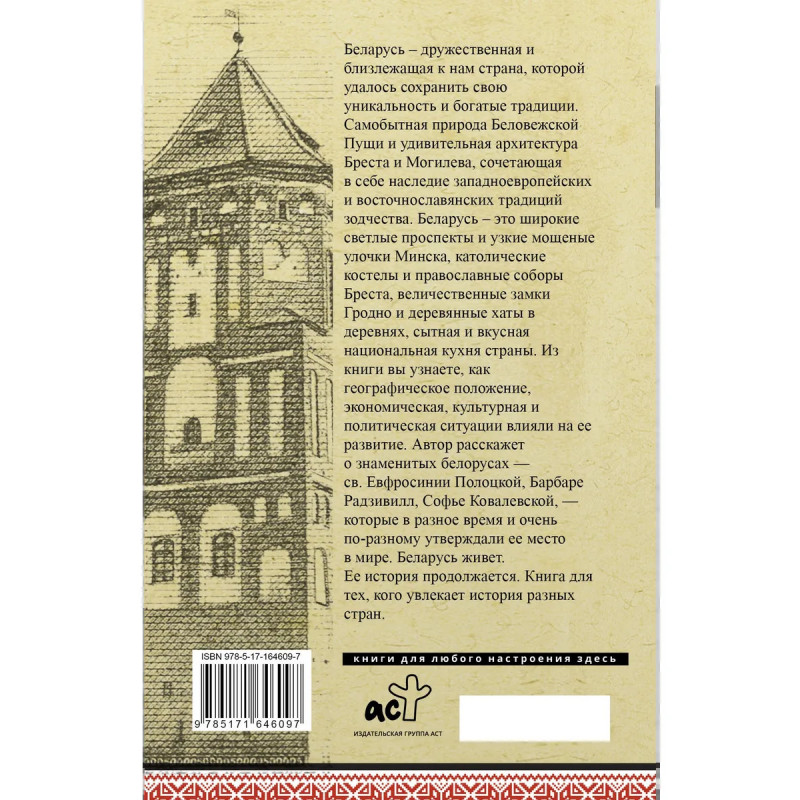 Беларусь дружественная и близлежащая к нам страна, которой удалось сохранить свою уникальность и богатые тради- ции. Самобытная природа Беловежской Пущи и удивительная архитектура Бреста и Могилева сочетает в себе наследие запад- ноевропейских и восточнославянских традиций зодчества. Бела- русь это широкие светлые проспекты и узкие мощеные улочки Минска, католические костелы и православные соборы Бреста, величественные замки Гродно и деревянные хаты в деревнях, сытная и вкусная национальная кухня страны. Из книги вы узнаете, как географическое положение, экономическая, культурная и политическая ситуации влияли на ее развитие. Автор расскажет о знаменитых белорусах св. Евфросинии Полоцкой, Барба- ре Радзивилл, Софье Ковалевской, которые в разное время и очень по-разному утверждали ее место в мире. Беларусь живет. Ее история продолжается. Книга для тех, кого увлекает история разных стран.