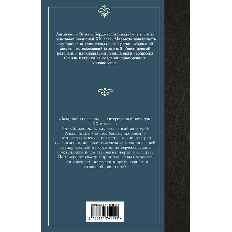 "Заводной апельсин" – литературный парадокс ХХ столетия. Продол-жая футуристические традиции в литературе, экспериментируя с языком, на котором говорит рубежное поколение malltshipalltshikov и kisok "надсатых", Энтони Бёрджесс создает роман, признанный классикой современной литературы. Умный, жестокий, харизматичный антигерой Алекс, лидер уличной банды, проповедуя насилие как высокое искусство жизни, как род наслаждения, попадает в железные тиски новейшей государственной программы по перевоспитанию преступников и сам становится жертвой наси-лия. Можно ли спасти мир от зла, лишая человека воли совершать пос-тупки и превращая его в "заводной апельсин"? Этот вопрос сегодня актуален так же, как и вчера, и вопрос этот автор задает читателю.
