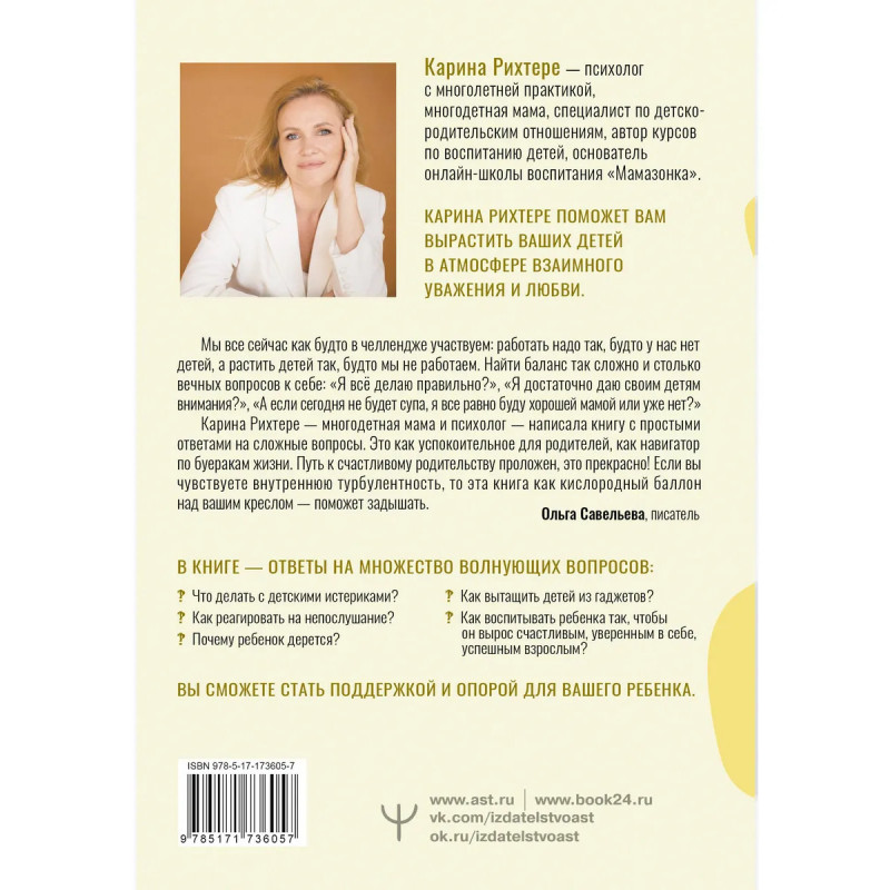Эта книга станет настольной для мам и пап, которые хотят растить своих детей в атмосфере взаимного уважения, доверия и любви, без обид и чувства вины. Автор — многодетная мама и психолог Карина Рихтере создала настоящую азбуку воспитания! Вы узнаете, как сохранить материнский ресурс, как развивать эмоциональный интеллект и здоровую привязанность у вас и вашего ребенка. Эта книга поможет вам стать настоящей опорой для вашего ребенка и воспитывать — в радость! Вы сможете: · наладить отношения с ребенком; · научиться понимать его потребности; · сделать воспитание эффективным и легким, без ссор, вашего выгорания и негативных эмоций; · вырастить ребенка успешным, уверенным и счастливым. Сделайте шаг к осознанному и позитивному воспитанию уже сегодня! Книга в твердой обложке.