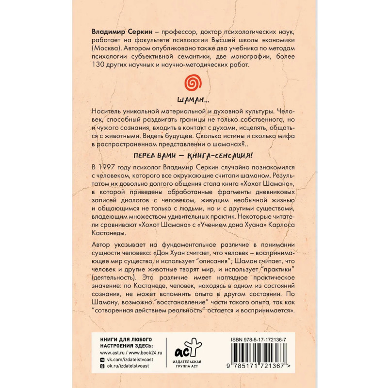 ПЕРЕД ВАМИ – КНИГА-СЕНСАЦИЯ! В 1997 году психолог Владимир Серкин случайно познакомился с человеком, которого все окружающие считали шаманом. Результатом их довольно долгого общения стала книга "Хохот Шамана", в которой приведены обработанные фрагменты дневниковых записей диалогов с человеком, живущим необычной жизнью и общающимся не только с людьми, но и с другими существами, владеющим множеством удивительных практик. Некоторые читатели сравнивают "Хохот Шамана" с "Учением дона Хуана" Карлоса Кастанеды.