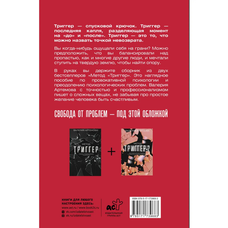 Триггер – спусковой крючок. Триггер – последняя капля, разделяющая момент на "до" и "после". Триггер – это то, что можно назвать точкой невозврата. Вы когда-нибудь ощущали себя на грани? Можно предположить, что вы балансировали над пропастью, как и многие другие люди, и мечтали ступить на твердую землю, чтобы найти опору. В руках вы держите сборник из двух бестселлеров "Метод "Триггер". Это наглядное пособие по провокативной психологии и преодолению психологических проблем. Валерия Артемова с точностью и профессионализмом пишет о сложных вещах, не забывая про простое желание человека быть счастливым. Свобода от проблем – под этой обложкой.