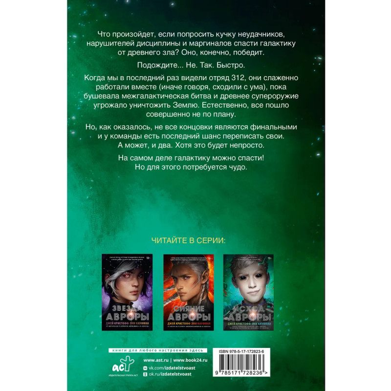 – Заключительная часть цикла и продолжение романов «Звезда Авроры» и «Сияние Авроры». – От автора бестселлеров «Годсгрейв», «Империя вампиров», «Неночь». Также совместно с Эми Кауфман создал цикл «Досье “Иллюминэ”». – Понравится фанатам научной фантастики, молодежных приключений и историй о космосе. – Динамичная история о группе молодых проблемных ребят, на чьи плечи легла миссия по спасению всей галактики от неминуемой гибели.