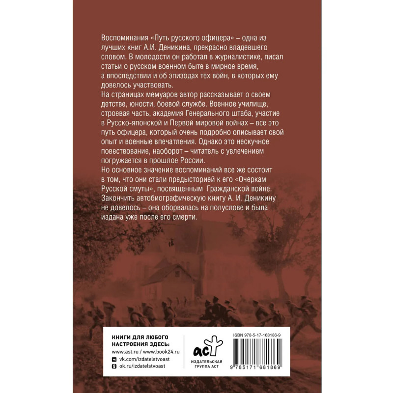 Воспоминания "Путь русского офицера" – одна из лучших книг А.И. Деникина, прекрасно владевшего словом. В молодости он работал в журналистике, писал статьи о русском военном быте в мирное время, а впоследствии и об эпизодах тех войн, в которых ему довелось участвовать. На страницах мемуаров автор рассказывает о своем детстве, юности, боевой службе. Военное училище, строевая часть, академия Генерального штаба, участие в Русско-японской и Первой мировой войнах – все это путь офицера, который очень подробно описывает свой опыт и военные впечатления. Однако это нескучное повествование, наоборот – читатель с увлечением погружается в прошлое России. Но основное значение воспоминаний все же состоит в том, что они стали предысторией к его "Очеркам Русской смуты", посвященным Гражданской войне. Закончить автобиографическую книгу А. И. Деникину не довелось – она оборвалась на полуслове и была издана уже после его смерти.