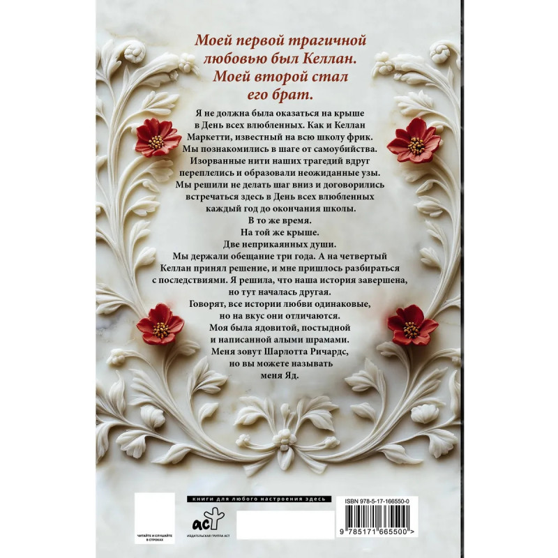В то же время. Одна крыша. Две беспокойные души. Мы сдерживали свое обещание в течение трех лет. Четвертого числа Келлан принял решение, и мне пришлось разбираться с последствиями. Когда я подумал, что наша история закончилась, то началась другая. Говорят, все истории любви выглядят одинаково, а на вкус разные. Моя была ядовитой, позорной и написанной алыми шрамами. Меня зовут Шарлотта Ричардс, но вы можете звать меня Яд.