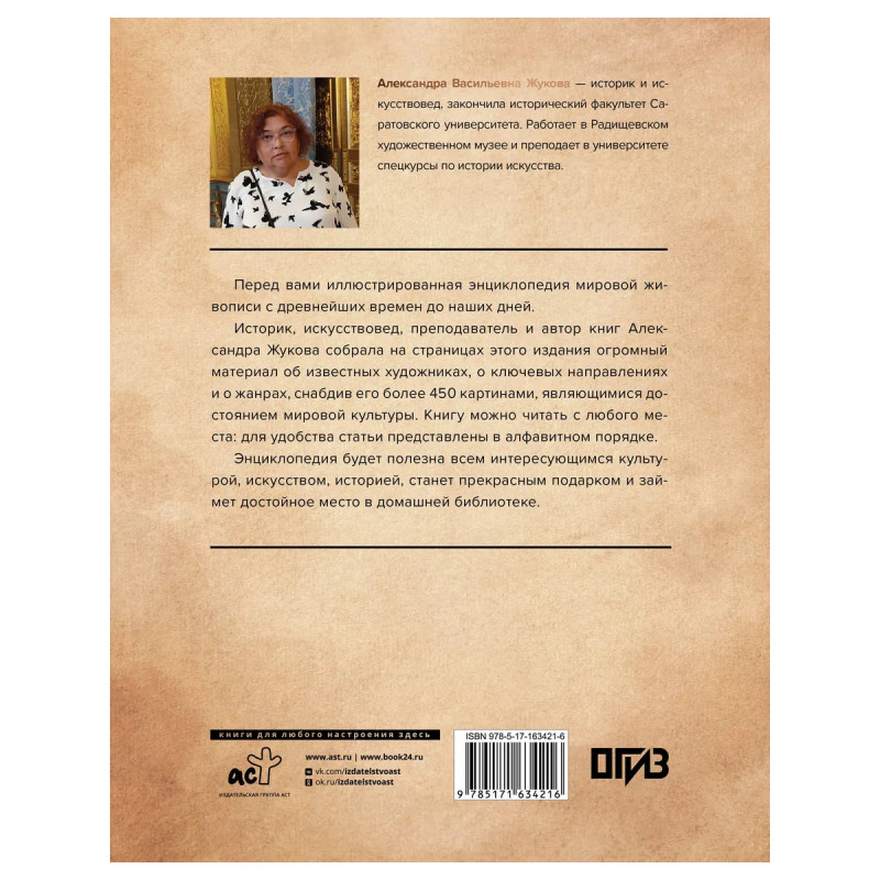 Иллюстрированный искусствоведческий словарь Александра Васильевна Жукова — историк и искусствовед, закончила исторический факультет Саратовского университета. Работает в Радищевском художественном музее и преподает в университете спецкурсы по истории искусства. Перед вами иллюстрированная энциклопедия мировой живописи с древнейших времен до наших дней. Историк, искусствовед, преподаватель и автор книг Александра Жукова собрала на страницах этого издания огромный материал об известных художниках, о ключевых направлениях и о жанрах, снабдив его более 450 картинами, являющимися достоянием мировой культуры. Книгу можно читать с любого места: для удобства статьи представлены в алфавитном порядке. Энциклопедия будет полезна всем интересующимся культурой, искусством, историей, станет прекрасным подарком и займет достойное место в домашней библиотеке.