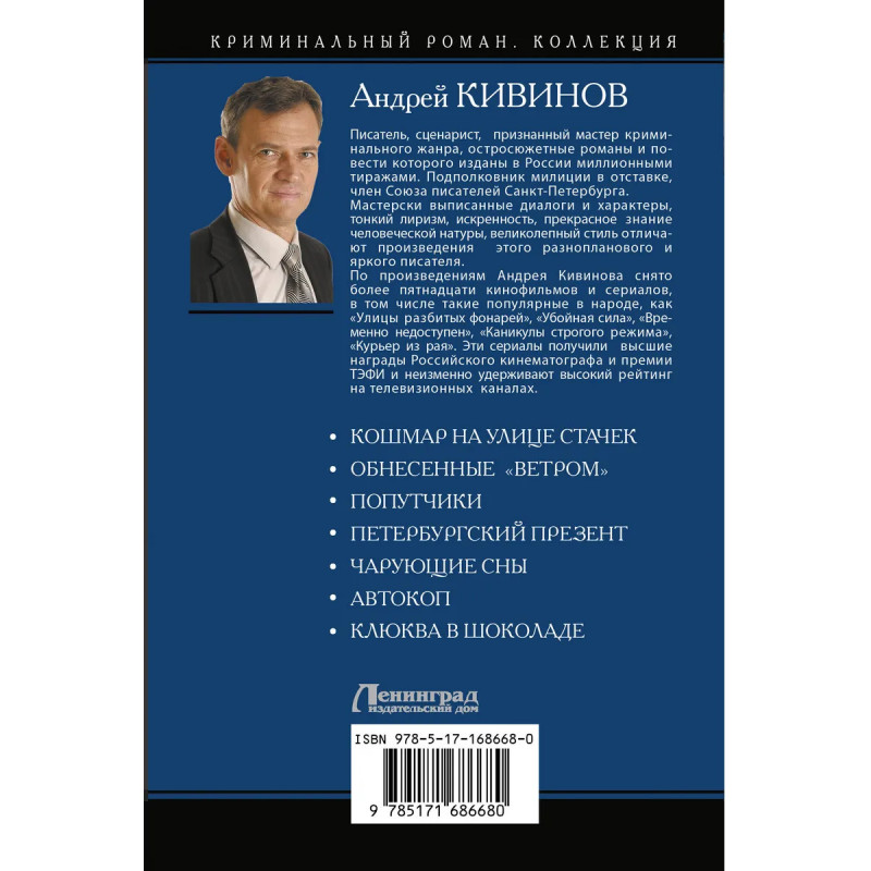 — Сборник остросюжетной и криминальной прозы. В книгу вошли семь повестей и рассказов: «Кошмар на улице Стачек», «Обнесённые “ветром”», «Попутчики», «Петербургский презент», «Чарующие сны», «Автокоп», «Клюква в шоколаде». — Андрей Кивинов — известный писатель и сценарист. Широкую известность получил как создатель первого сезона сериала «Улицы разбитых фонарей». По его работам сняты такие сериалы и фильмы, как: «Убойная сила», «Временно недоступен», «Каникулы строгого режима», «Курьер из рая» и другие. — Понравится поклонникам творчества Данила Корецкого. — Общий тираж книг Андрея Кивинова превышает 20 миллионов экземпляров!