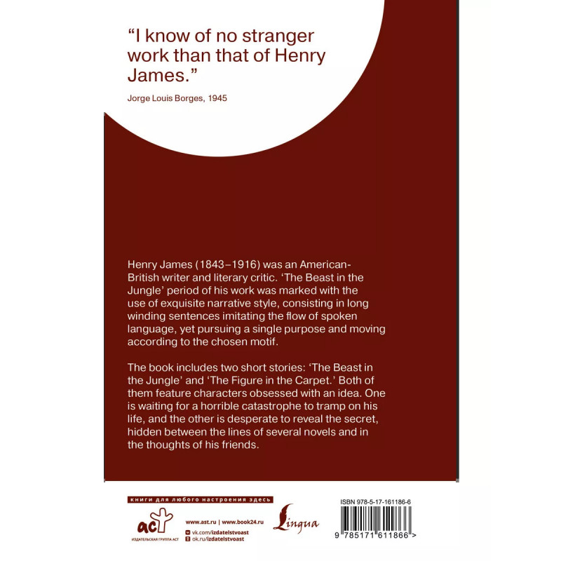 The Beast in the Jungle. The Figure in the Carpet. Генри Джеймс (1843-1916) - американский писатель и литературный критик. Поздний период его творчества - к которому относятся в том числе заглавные рассказы этого сборника - характеризуется замысловатым и неординарным стилем повествования. Длинные витиеватые предложения имитируют течение устной речи, по спирали единого мотива уводя читателя к центру смыслового водоворота. Сборник включает два рассказа Генри Джеймса: "The Beast in the Jungle" и "The Figure in the Carpet". В центре каждого из них находится персонаж, одержимый идеей: один живет в предчувствии катастрофы, которая должна разрушить его жизнь; второй ищет разгадку тайны, спрятанную между строк романов. Рассказы публикуются на английском языке без адаптации и сокращений.