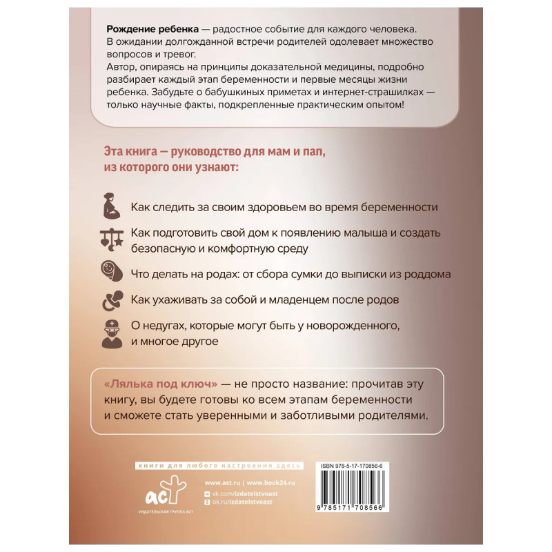 Рождение ребенка — радостное событие для каждого человека. В ожидании долгожданной встречи родителей одолевает множество вопросов и тревог. Автор, опираясь на принципы доказательной медицины, подробно разбирает каждый этап беременности и первые месяцы жизни ребенка. Забудьте о бабушкиных приметах и интернет-страшилках — только научные факты, подкрепленные практическим опытом! Эта книга — руководство для мам и пап, из которого они узнают: • Как следить за своим здоровьем во время беременности; • Как подготовить свой дом к появлению малыша и создать безопасную и комфортную среду; • Что делать на родах: от сбора сумки до выписки из роддома; • Как ухаживать за собой и младенцем после родов; • О недугах, которые могут быть у новорожденного, и многое другое. "Лялька под ключ" — не просто название: прочитав эту книгу, вы будете готовы ко всем этапам беременности и сможете стать уверенными и заботливыми родителями.