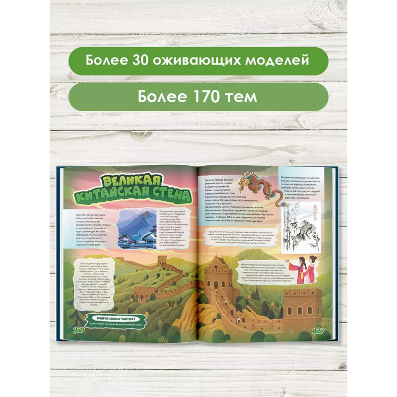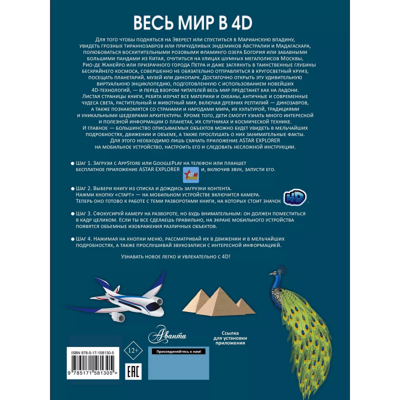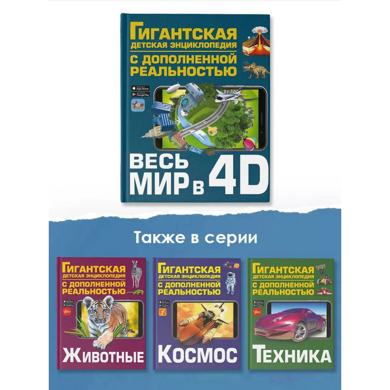 Эта большая детская энциклопедия подготовлена в не совсем привычном для читателя формате здесь используются 4D-технологии, с помощью которых он сможет рассмотреть представленные объекты и явления в мельчайших подробностях, движении и объеме. В книге описаны материки и океаны, острова, реки и озера, горы и вулканы, степи и пустыни, климатические особенности и явления, страны и народы их населяющие, чудеса света древние и современные, животный и растительный мир нашей планеты, Вселенная и космос. Таким образом, эту энциклопедию можно смело назвать гигантской как по объему, так и по широте охватываемых тем. Выдающиеся архитектурные сооружения, неповторимые природные ландшафты, космические тела, явления и технику, удивительных зверей, птиц и рептилий читатель не только увидит на многочисленных иллюстрациях, сопровождающих тексты, но и услышит о них занимательную информацию, использовав возможности дополненной реальности.