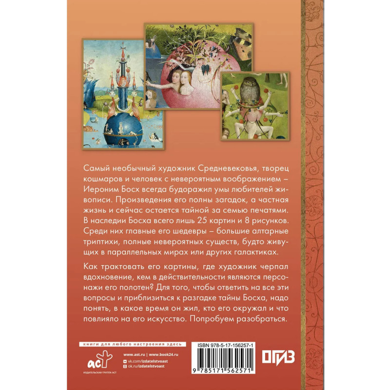 Самый необычный художник Средневековья, творец кошмаров и человек с невероятным воображением – Иероним Босх всегда будоражил умы любителей живописи. Произведения его полны загадок, а частная жизнь и сейчас остается тайной за семью печатями. В наследии Босха всего лишь 25 картин и 8 рисунков. Среди них главные его шедевры – большие алтарные триптихи, полные невероятных существ, будто живущих в параллельных мирах или других галактиках. Как трактовать его картины, где художник черпал вдохновение, кем в действительности являются персонажи его полотен? Для того, чтобы ответить на все эти вопросы и приблизиться к разгадке тайны Босха, надо понять, в какое время он жил, кто его окружал и что повлияло на его искусство. Попробуем разобраться. Этот великолепно иллюстрированный мини-альбом со смножеством красочных иллюстраций рассказывает о жизни и творчестве великого мастера.